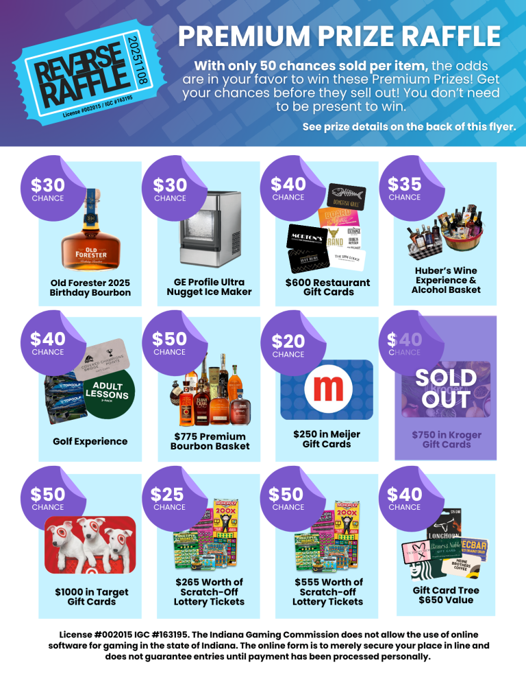 Contact Cathy Reid at creid@stecharities.org or at 812-924-4003 for reverse raffle chances.